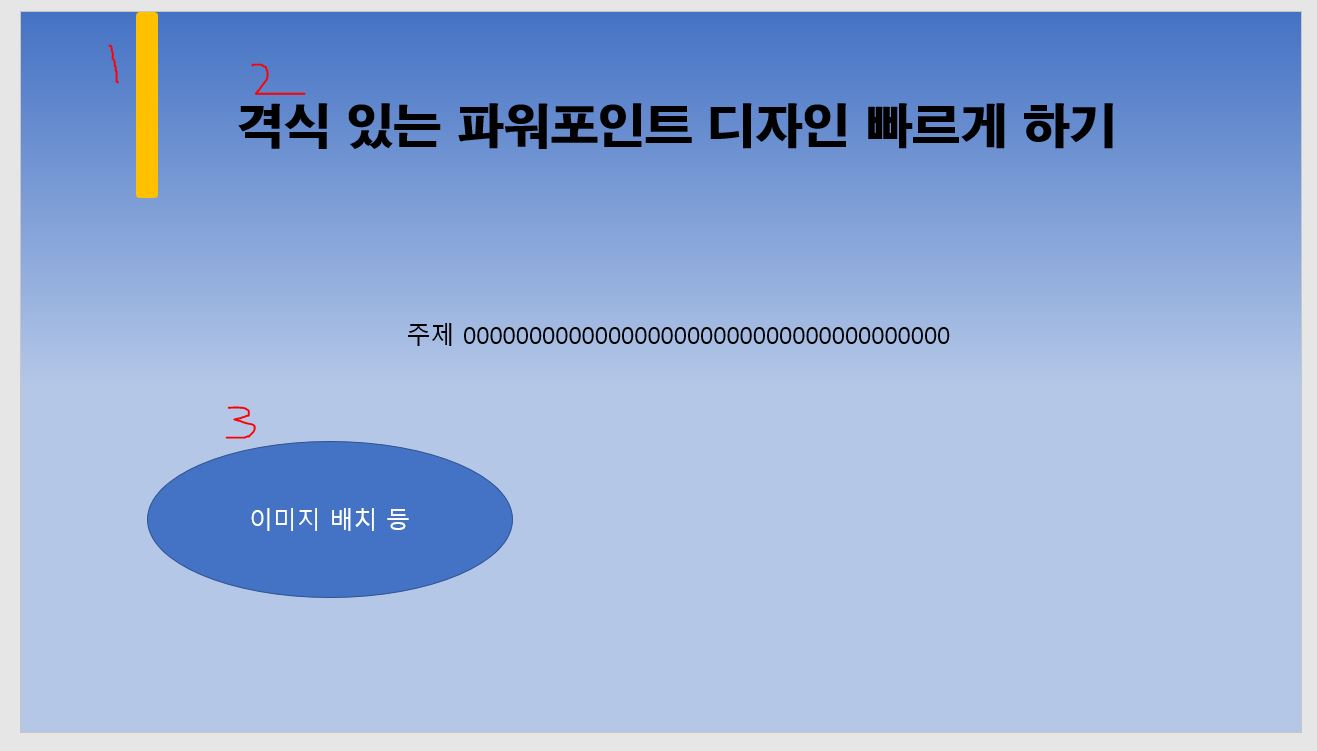 항상 파워포인트를 작업은 시간의 촉박함이 많을 때가 너무나 많습니다. 특히 격식을 차려야 할 디자인이 필요할 때 빠르게 하는 방법을 한번 고민해 보았습니다.