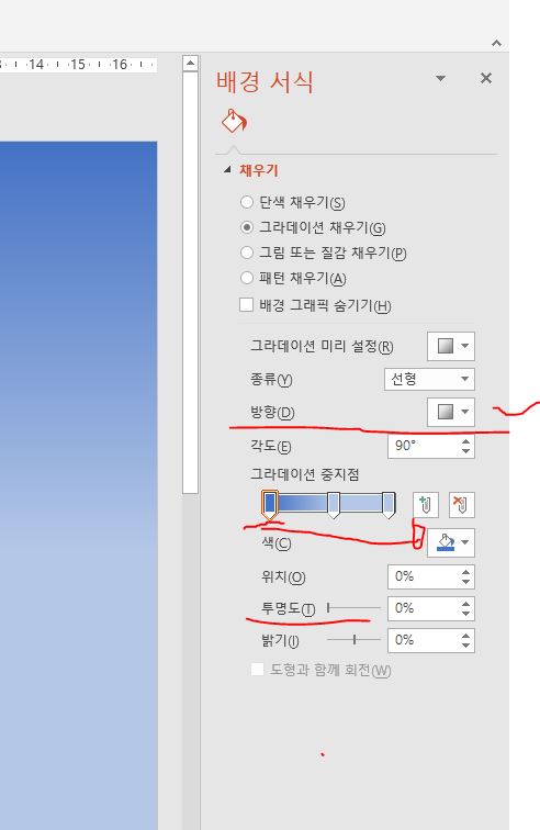 그리고, 배경서식에서 방향, 그라데이션 중지점별 색상을 선택하고 투명도 등을 적당히 조정합니다. 아주 간단하지만 핵심적인 부분 입니다. 중지점별로 색을 선택할 수 있고, 필요없는 중지점은 삭제하거나 추가하여 조정 할 수 있습니다.