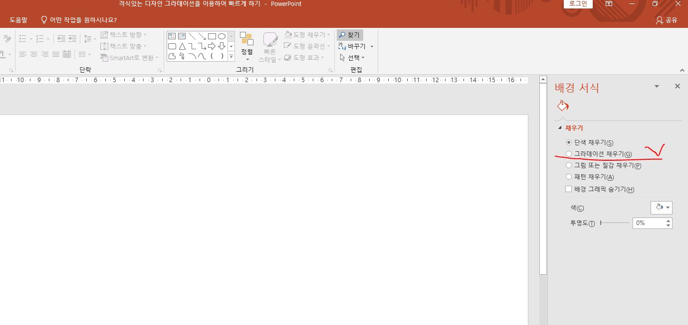 먼저 아래와 같이 빈 슬라이드에 오른쪽 마우스를 이용해 배경서식을 열고 그라데이션 채우기를 선택합니다.