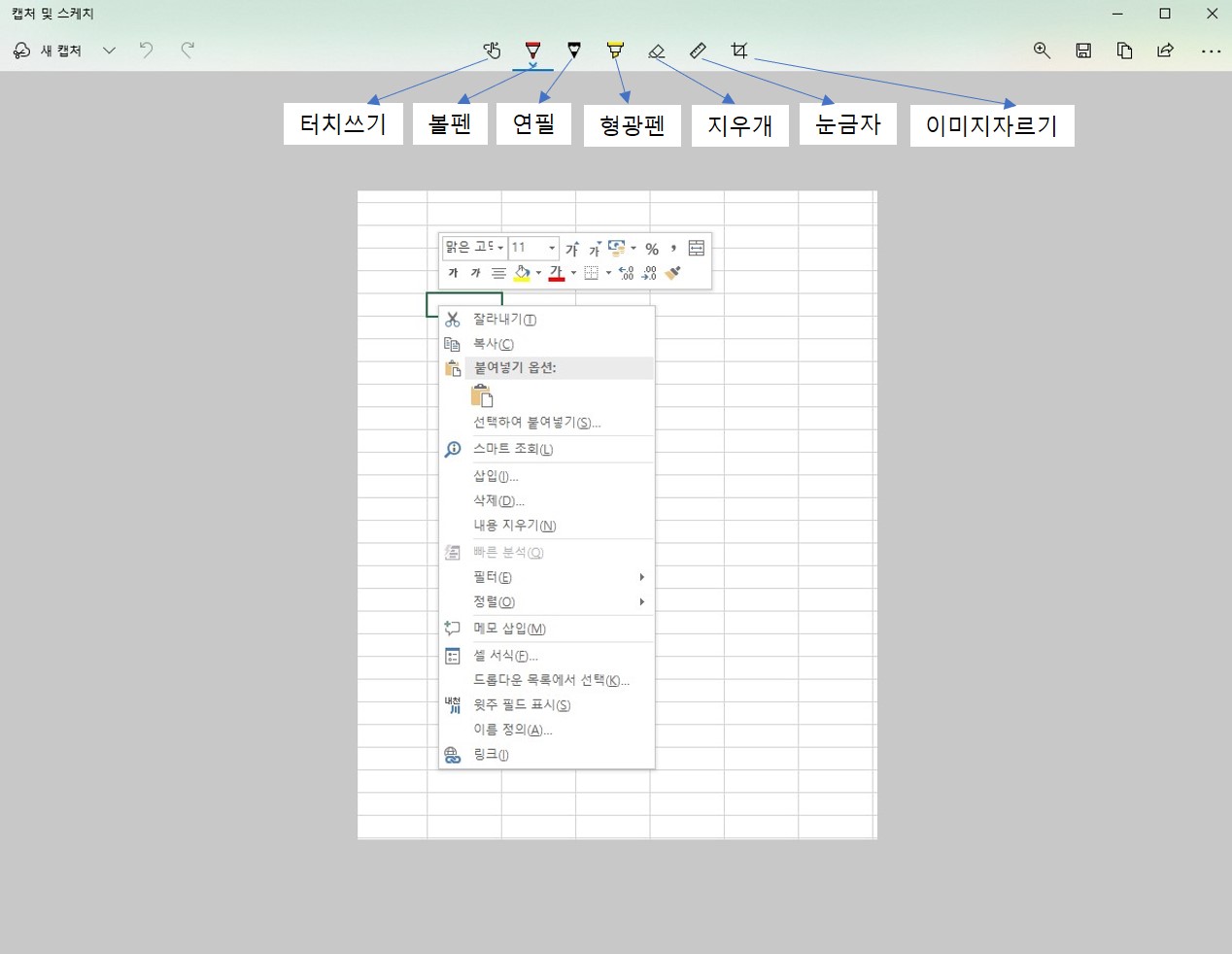 보통 오피스에서 오른쪽마우스를 눌러 나오는 메뉴를 같이 캡처 받아야 할 경우가 많습니다. 캡처도구의 시간지연 기능을 써도 되지만 번거럽습니다. 정말 이거 괜찮습니다. 오른쪽 마우스 눌러 오피스 메뉴를 실행 시킨 후, 위 단축키를 눌러 캡처받으면 오른쪽 마우스 실행으로 나오는 화면까지 그대로 캡처 받을 수 있습니다.