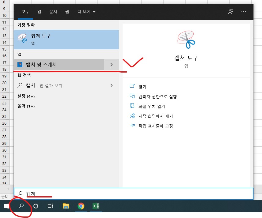 먼저 아래와 같이 작업줄에서 검색을 눌러서 캡처를 입력하면 두 기능이 나옵니다. 캡처 및 스케치를 시작화면에 고정하여 사용하길 추천 드립니다.