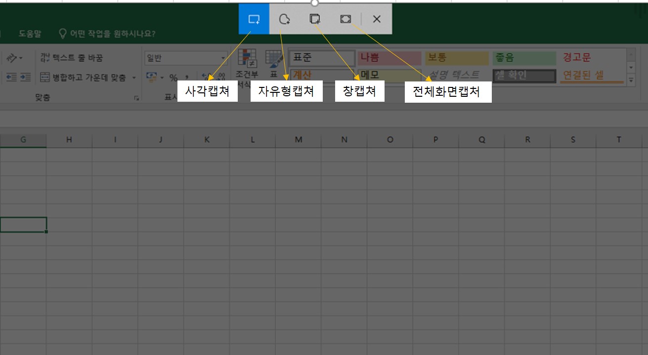 실행시키면 아라애와 같이 모니터화면 상단에 4개의 버튼이 나타납니다. 화면 설명을 위해 엑셀화면을 뛰우고 실행한 것입니다. 왼쪽부터 사각캡처, 자유형캡처, 창캡처, 전체화면캡처가 나옵니다. 이 도구를 사용을 추천드리는 가장 중요한 키포이트는 단축키 입니다. 바로 "윈도우창표시 키보드 + Shift + S' 이 단축키입니다. 습관들여 사용해 보세요.