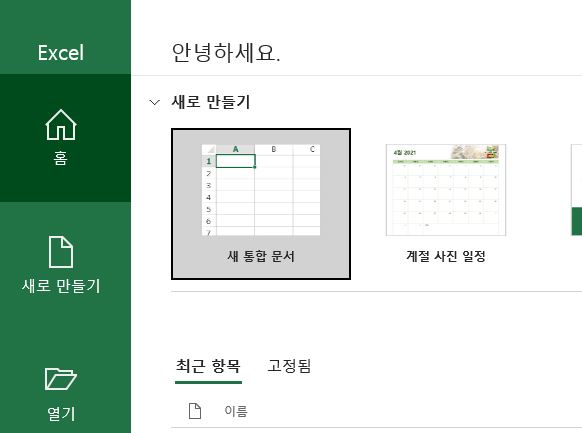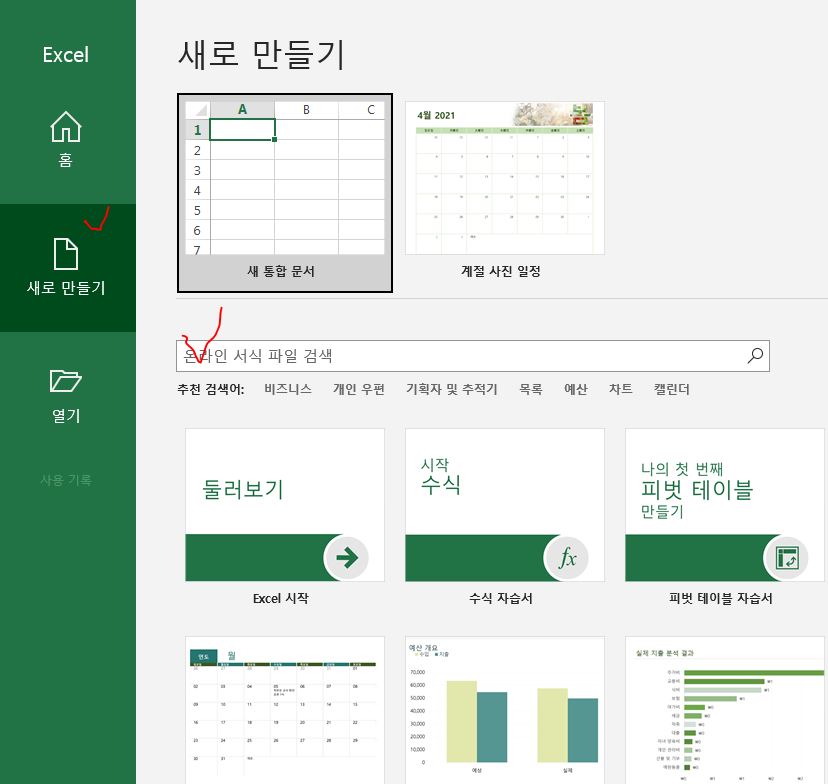 엑셀을 처음 열었을 때 아래와 같이 화면이 나오는데 여기서 보통 새통합문서로 바로 들어가서 작업하는 것이 일반적입니다. 그러나 만약 특정한 양식을 바탕으로 작업을 하고 싶다면 우선 왼쪽 텝의 새로 만들기를 한번 눌러 보세요.