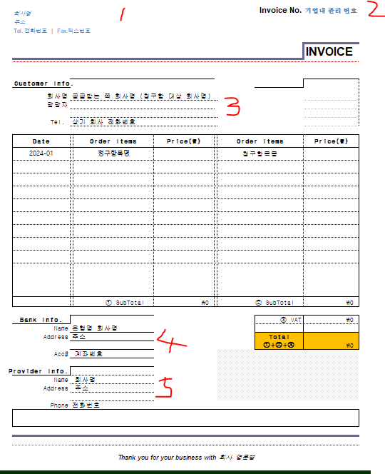 4번이 정말 중요하겠죠. 이곳에는 자사의 은행명 회사명 주소 계좌번호가 들어가야 합니다. 이 것을 보고 공급받는자가 대금을 입금해 주기 때문입니다.